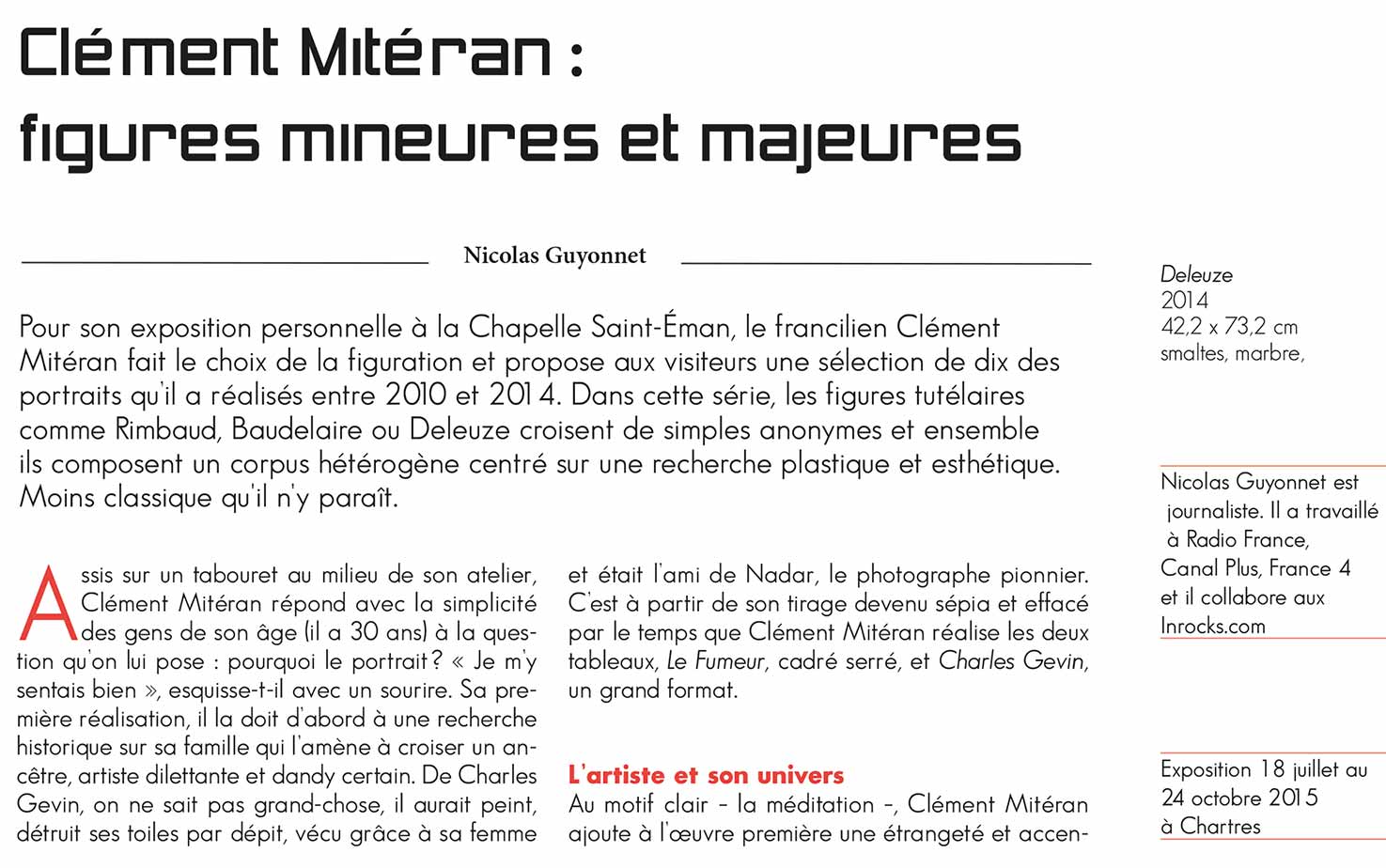 Solo exhibition by Clément Mitéran showcasing his portraits created between 2008 and 2014 at the Saint-Eman Chapel in Chartres, from July 18 to October 25, 2015. The exhibition is open from 2:00 PM to 6:00 PM, closed on Mondays.The opening reception will take place on Saturday, July 18, at 4:00 PM.